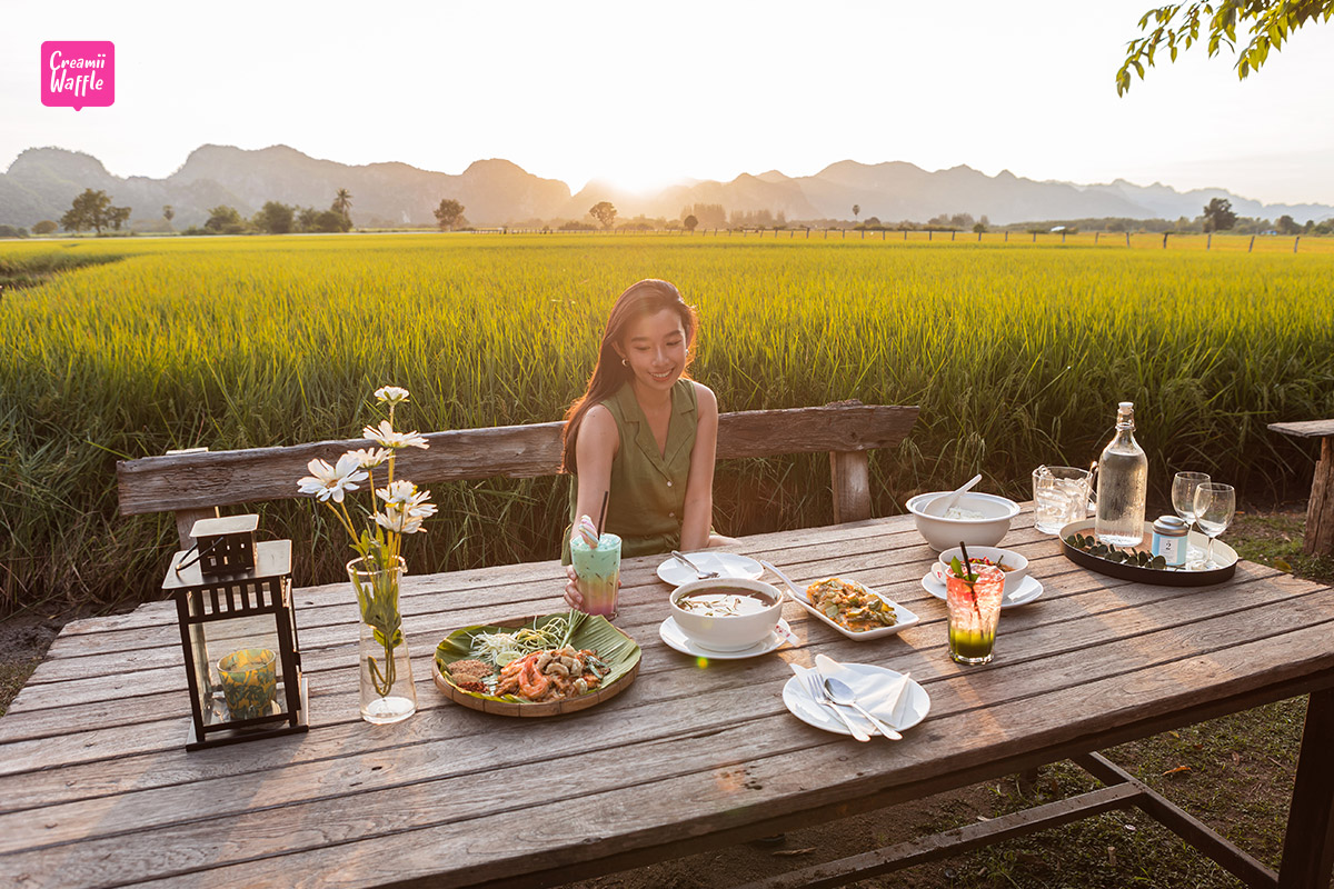 ช่วงเย็นๆเรามาดินเนอร์ ในบรรยากาศทุ่งนากันดีกว่าค่ะ คือถ้าใครมานะ แนะนำว่ามานั่งทานอาหาร เครื่องดื่ม ที่นี่ด้วยจะดีมาก เพราะว่าช่วงเย็น พระอาทิตย์ตก แสงสวยมาก แบบสวยไม่ไหวแล้ว พูดแล้วอยากจะกลับไปอีก แถมอาหารที่นี่อร่อยแรง! งงมาก เพราะว่าอร่อยทุกเมนูจริงๆค่ะ นี่ก็กินกับข้าวที่อื่นมาเยอะมากมายเหมือนกัน แต่กับข้าวของที่นี่ อร่อยแบบสไตล์บ้านๆ พูดเลยว่าสมัยนี้หาฝีมือแบบนี้ได้ยากมากก มาดูเมนูในวันนี้กันค่ะ